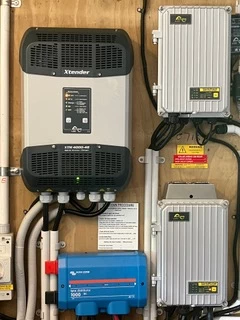 The beauty of this Studer system is its versatility, simplicity and robustness. The XTM4000 inverter basically consists of a DC-AC inverter, a powerful AC battery charger and a transfer relay and the operational control electronics. It has no internal MPPT solar energy input ports; the solar charging is done with two externally mounted solar charge/controllers. All of these three units are low-frequency pieces with a transformer employed rather than high-frequency transistor switching of most other systems. It is designed for off-grid operation where it's running 24/7/365.